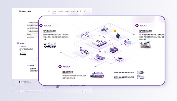 網(wǎng)站圍繞VI視覺體系,整體色調(diào)統(tǒng)一,簡約大氣,突出整體專業(yè)性。網(wǎng)頁運(yùn)用icon+動態(tài)效果展示,加入手繪2.5D產(chǎn)品圖案,,細(xì)節(jié)突出了氫楓中國的可持續(xù)綠色能源理念形象。