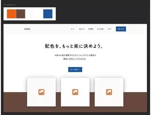 Paletton基色在前面已經決定好了,「淡藍色(#57CBEC)」輸入到左下角的BaseRGB中、下面的設計案例用來參考,讓我們來點擊「AddComplementary(追加上輔色)」按鈕。另外、通過點擊左上角的圖標,有大量的可供你決定的配色方案。在這一次,我們的強調色、就選擇顯眼的紅色(#FF6F59)吧。
